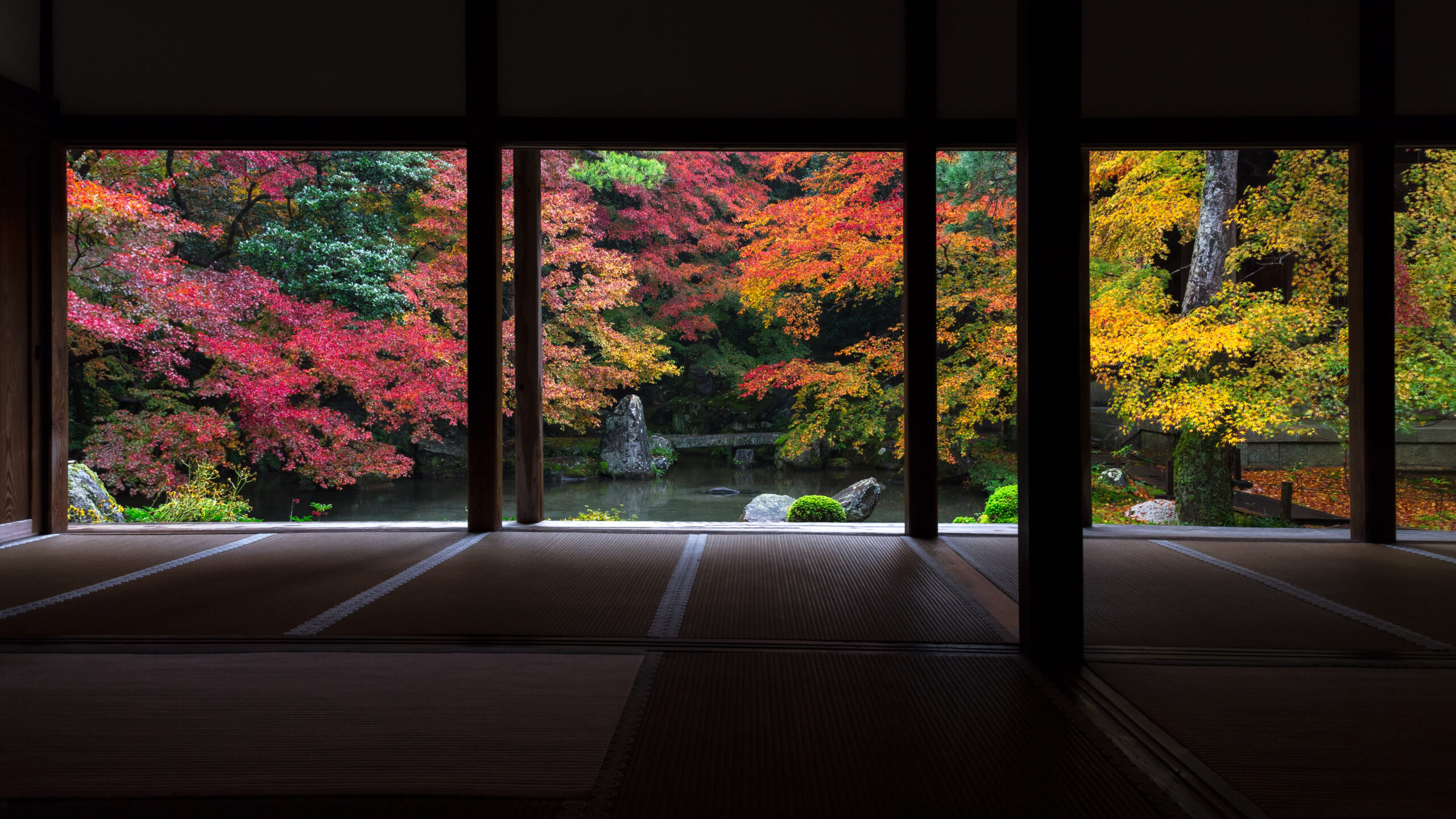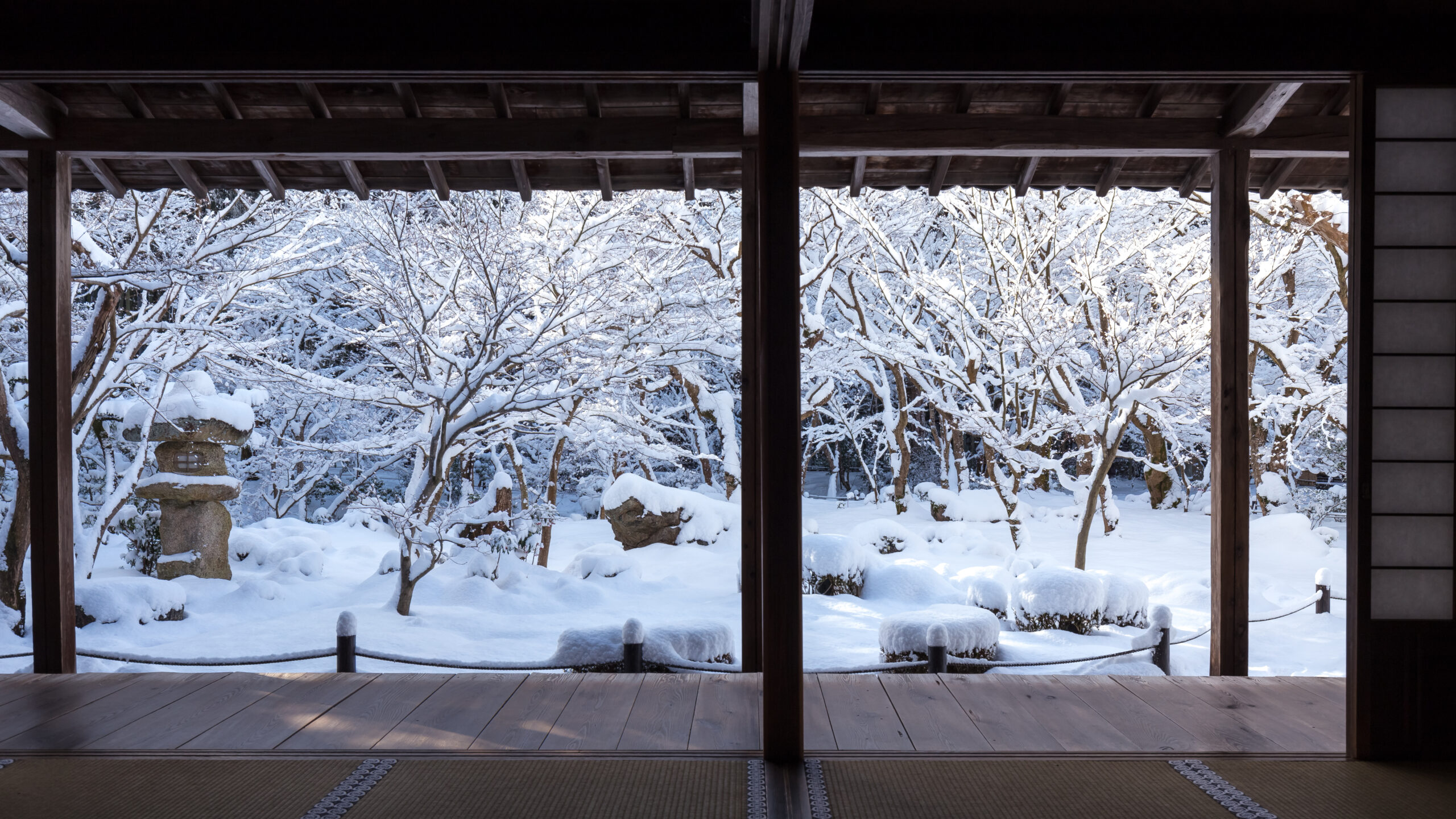Hosen-in Temple is one of our favorites temples in Kyoto, and one of the best places to visit to enjoy the seasons. Its two beautiful gardens include a variety of trees (including Japanese cherry blossoms), a bamboo grove, and a pine tree over 700 years old! In spring, flowers bloom on the trees and shrubs. In summer, the entire landscape is overtaken with deep green. In autumn, the leaves of Japanese maples turn brilliant red and orange. And in winter, snowfall creates stark and arresting contrasts of dark and light across the rocks and bare branches.