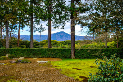 Originally built as a villa of Retired Emperor Go-Mizunoo, Entsuji was converted into a temple in 1678 and later became an imperial prayer temple of Emperor Reigen. The garden at Entsuji Temple is a classic example of shakkei (borrowed landscape) design, framing Mount Hiei. For example, the garden’s maple and cypress trees strategically frame stunning views of the mountains beyond. Within the garden itself, there are over 50 types of camellia flowers and carpets of bright green moss.