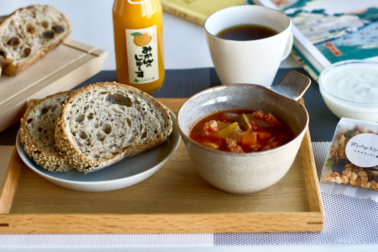 京都の味わいと自然の恵みたっぷりの朝食で、旅の朝を元気にスタート!京白味噌仕立ての野菜スープに本日のパン、京丹後産ヨーグルトや果汁100%ジュースなど。お部屋へお届けしますので、ゆっくりお召し上がりいただけます。