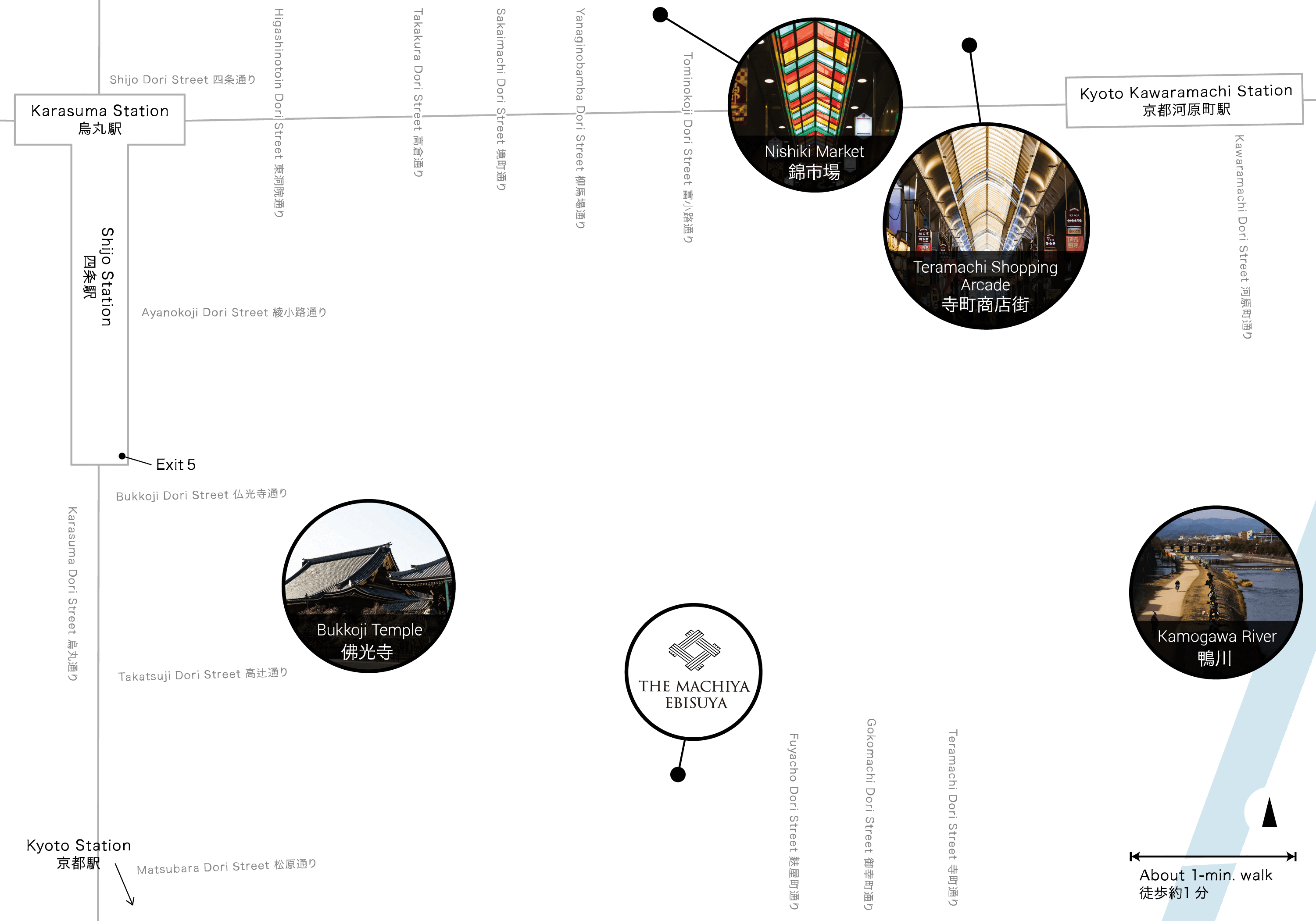 京都駅までは四条駅より2駅。阪急電車や地下鉄を使えば、嵐山や伏見方面へのアクセスも便利です。