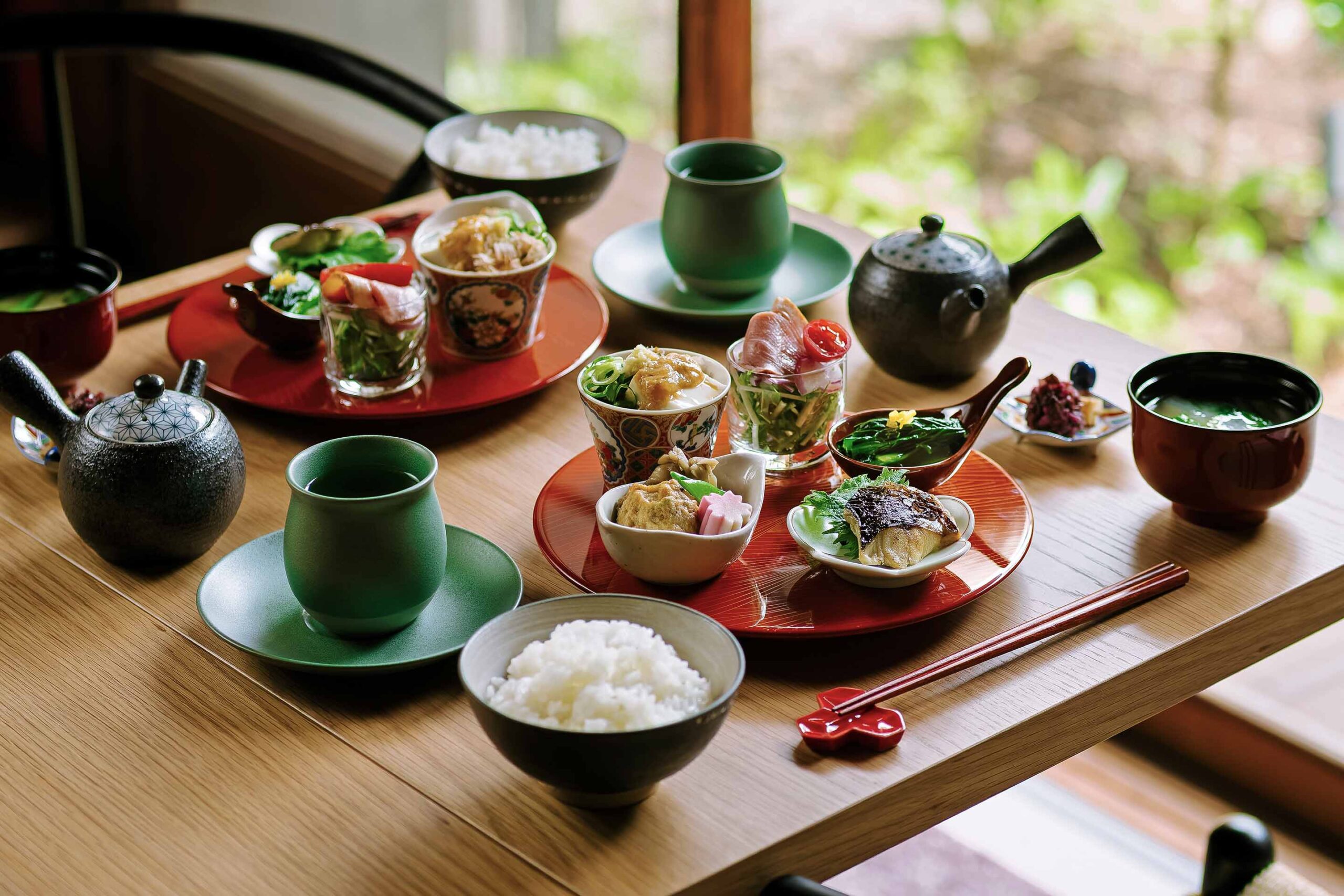 朝食は2種類からお選びいただけます。ひとつは「町家の出汁香る和朝食」。昆布と鰹節から丁寧に引いた出汁の旨みを一品一品に込めた、味わい深い和の膳です。出汁の染みた素材の味を大切にした料理は、旅の疲れをやわらげ、新しい一日を穏やかにスタートさせてくれます。