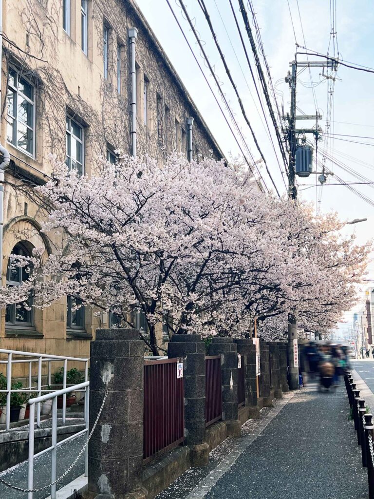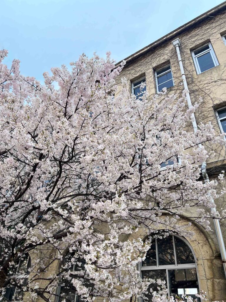ホテルから徒歩約10分の場所にある「京都文化協会」。かつての中学校の校舎を活用した趣を残す建物の周囲では、今年も早咲きの桜がそっと蕾をほどきました。レトロな建築の落ち着いた佇まいに、淡い桜色がやわらかく重なり合い、街並みを華やかに彩ります。本格的な桜の季節に先駆けて出逢える美しさです。