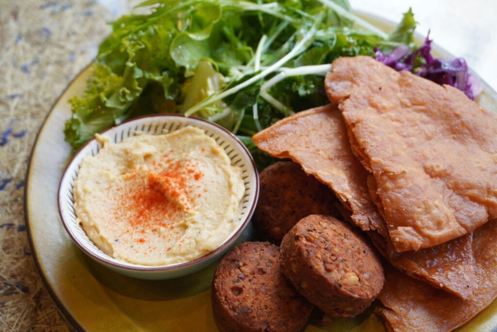 「ファラフェルと手作りフムスプレート」はヴィーガンの方にもお勧めです。ファラフェルとは、ひよこ豆にスパイスやハーブを混ぜ込んだコロッケに似たもので、フムスはひよこ豆をペースト状にしたもの。どちらも中東発祥の料理です。サクサクなトルティーヤチップスと色鮮やかな野菜との盛り合わせになっているのでたっぷり味わえます。