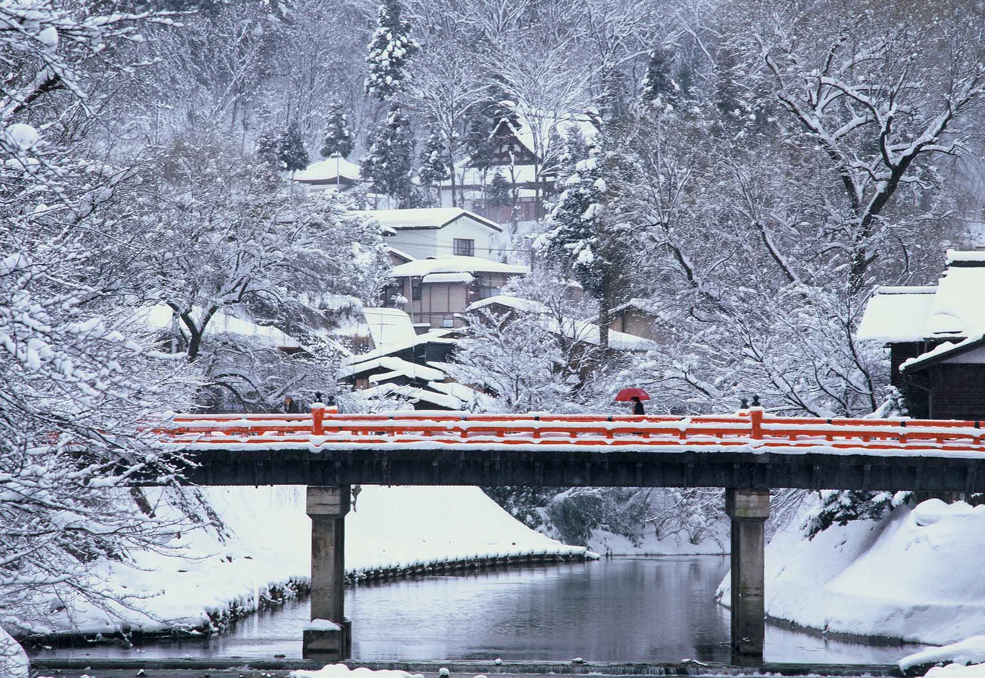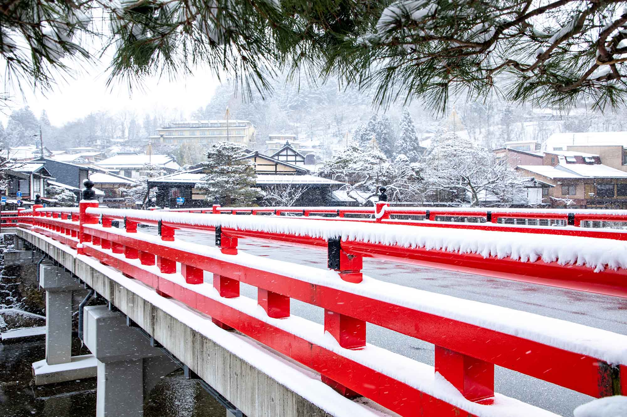 冬の高山市を象徴する風景といえば、やはり「中橋」の雪景色です。市内の中心部を流れる、宮川にかかる鮮やかな朱色の中橋は、白い雪に包まれた人気観光スポット「古い町並み」の中でひときわ存在感を放ち、そのコントラストは訪れる人を魅了します。朝、澄んだ冷たい空気の中で陽光を受けて浮かび上がる朱色の橋は、まるで絵画の一部のように美しく、写真に収めたくなる瞬間が広がります。