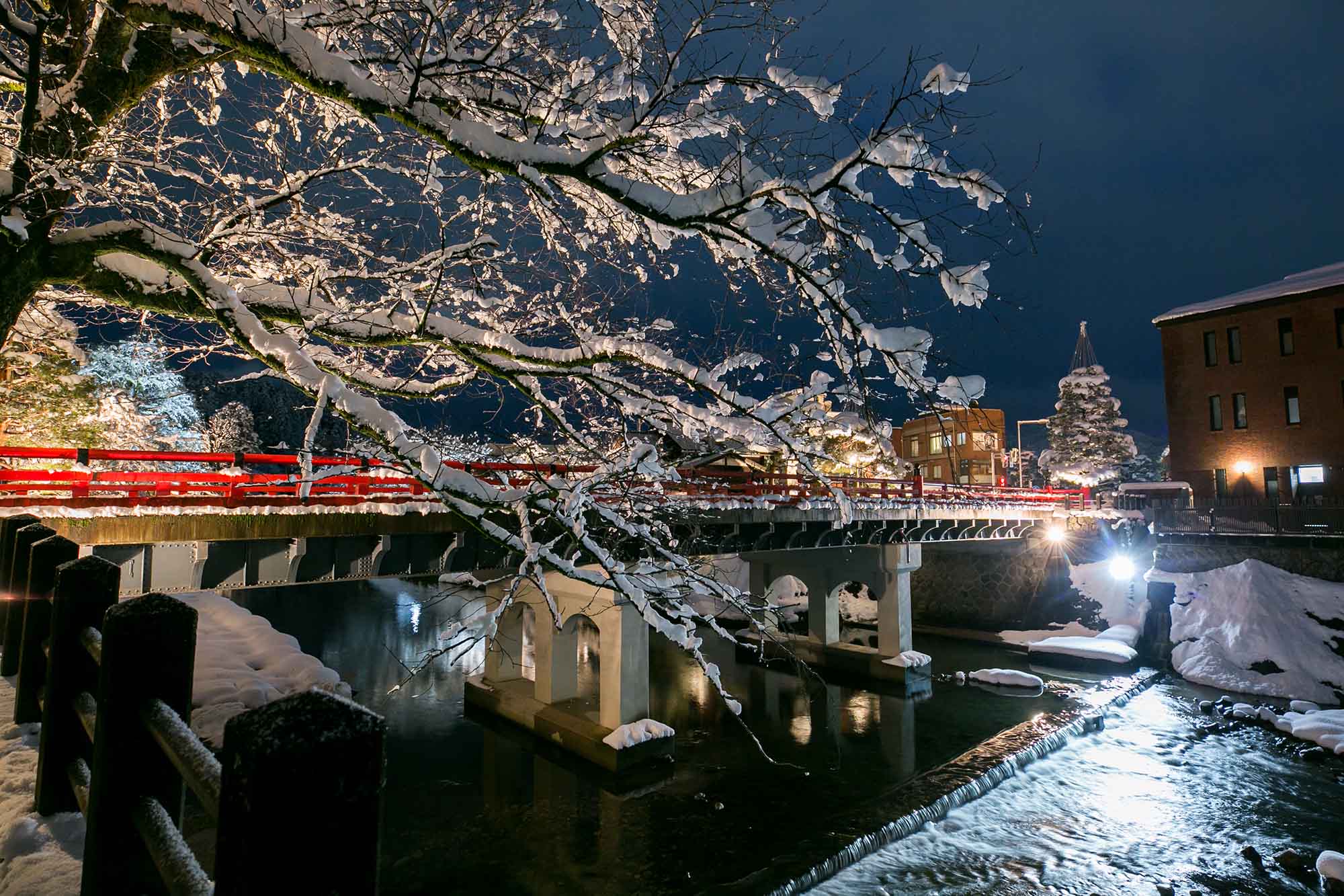そして夕暮れ時、街灯の柔らかな光が灯ると、中橋は昼間とはまた違った表情を見せます。朱色がより深みを増し、川面に反射する光とともに幻想的な雰囲気をつくり出します。雪がしんしんと降る夜には、静寂に包まれた橋がとてもロマンチックで、まるで物語の中に迷い込んだような気分に。