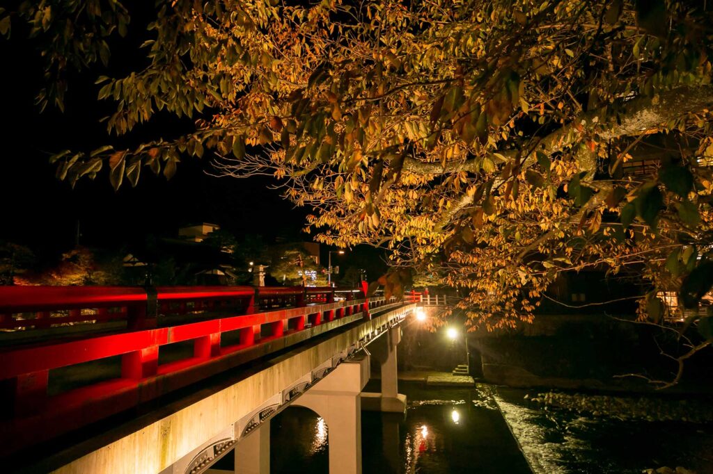 高山市の中心部を流れる清流・宮川にかかる「中橋」は、この季節の象徴ともいえる存在。朱色の橋と川沿いの紅葉が見事に調和し、水面に映る姿はまるで絵画のようです。昼は青空とのコントラストが鮮やかに、夕方には柔らかな光が橋と木々を包み込み、時間ごとに異なる表情を見せてくれます。