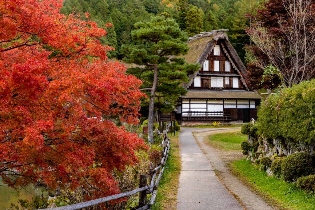 もう一つの人気スポット「飛騨の里」では、合掌造りの家々を背景に紅葉が広がり、里山らしい落ち着いた秋景色を堪能できます。さらに夜には、ライトアップされた紅葉が幻想的な雰囲気を演出。水面や家屋に映る光が揺らめき、昼間とは違った静かな美しさに心を奪われます。