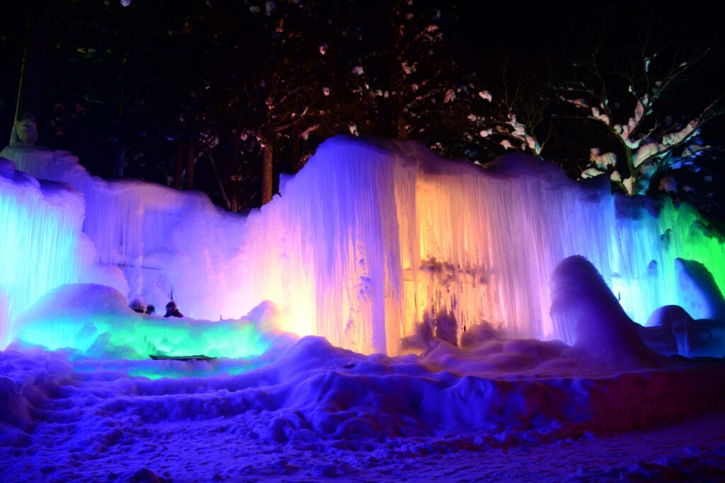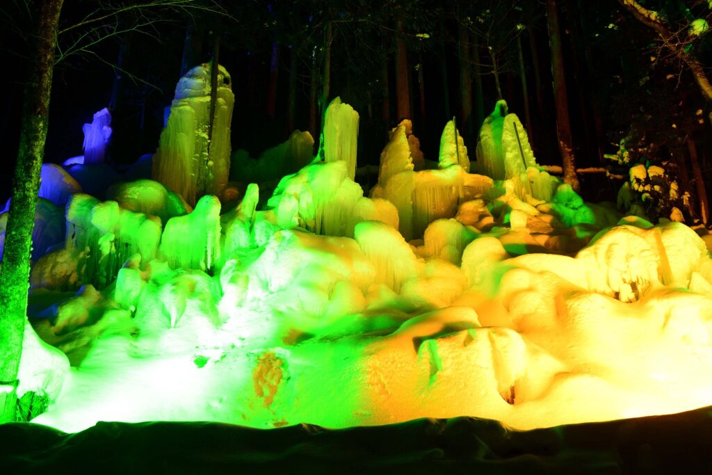 夜になるとライトアップが施され、昼間とはまったく異なる表情を見せます。青白い光に照らされた氷は闇の中に浮かび上がり、静かな山あいの空気と相まって、幻想的で神秘的な世界を演出します。澄み切った冬の空気、雪を踏みしめる音、水が凍り続ける気配が、訪れる人の五感を静かに刺激します。
