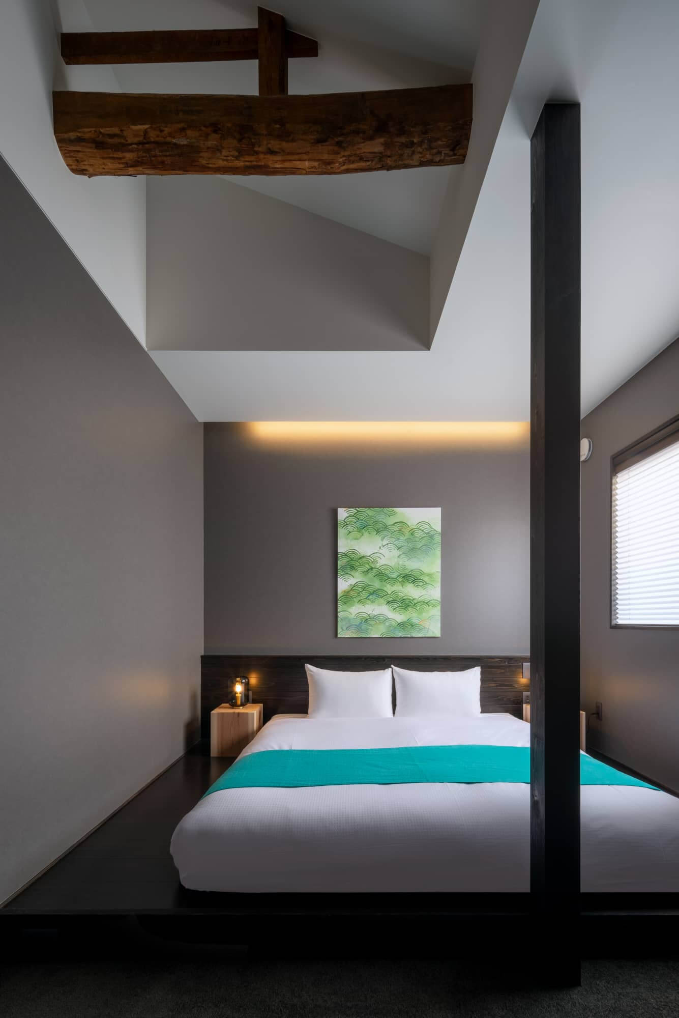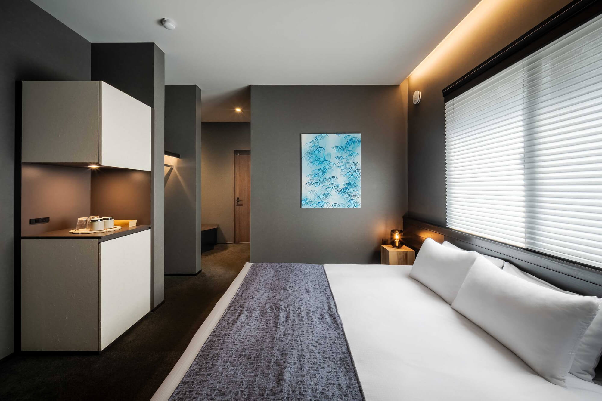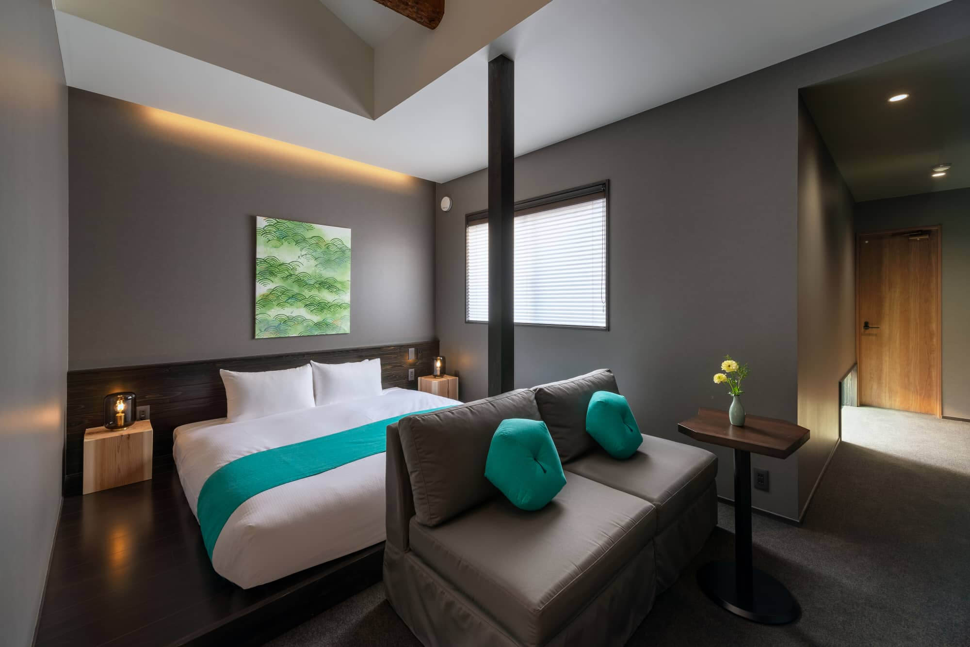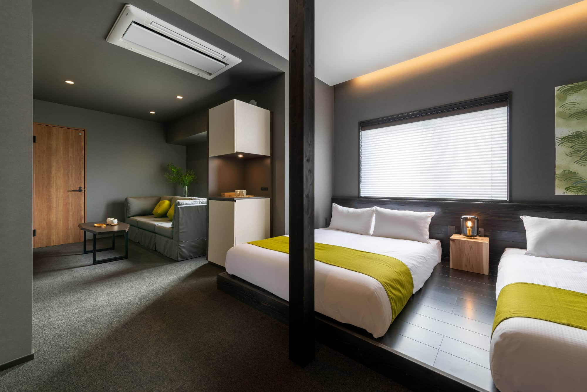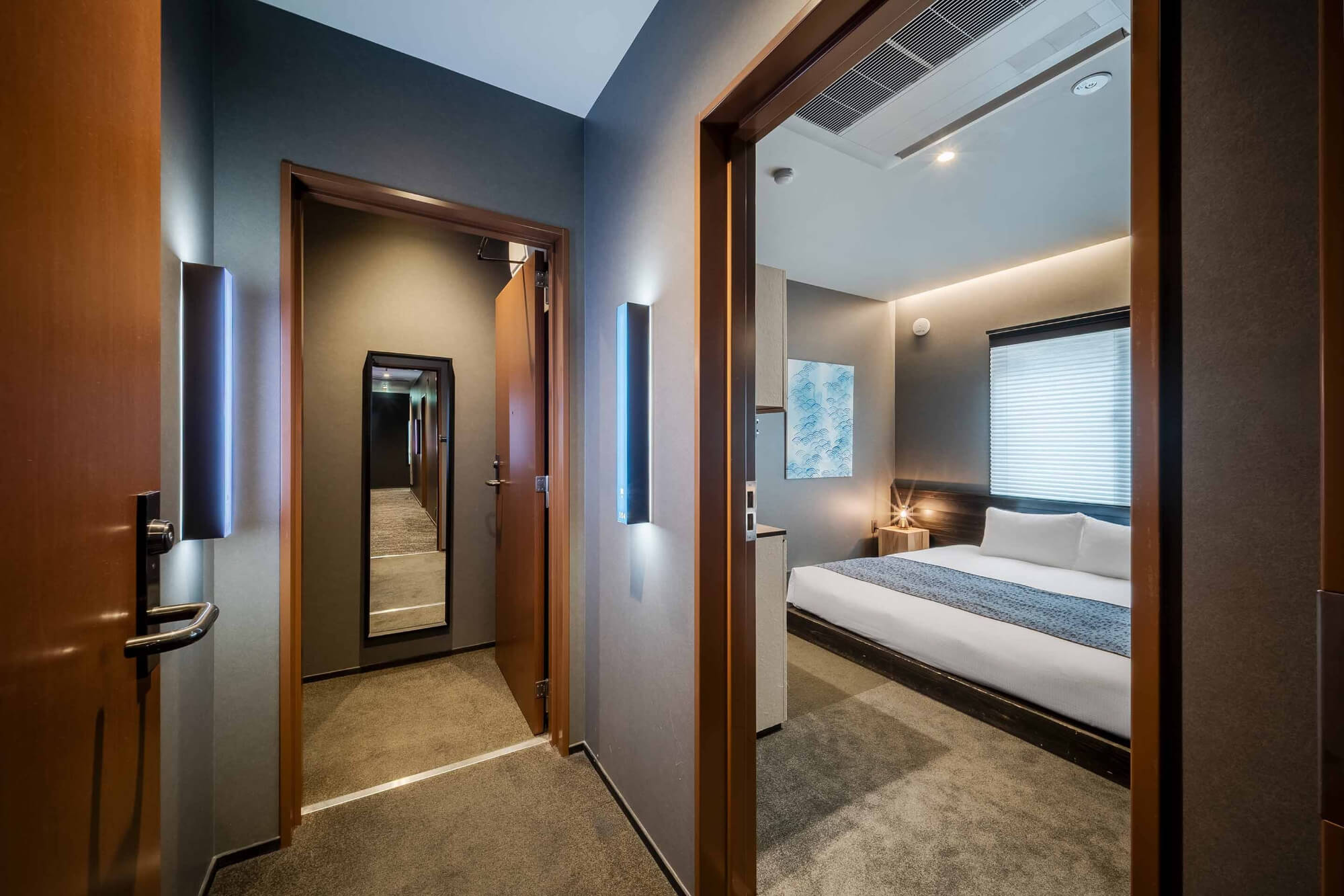 隣り合う洋室・和室の前扉がある共通玄関を通って、それぞれのお部屋を行き来しながらご滞在いただけます。ご家族やご友人グループごとにお部屋を分けて、お互いのプライバシーに配慮しながらも、団欒や旅路の相談などのコミュニケーションをスムーズに。ゆったりとしたキングベッド1台とソファーの洋室と、お布団2組をご用意できる和室で、5名様までご利用いただけます。