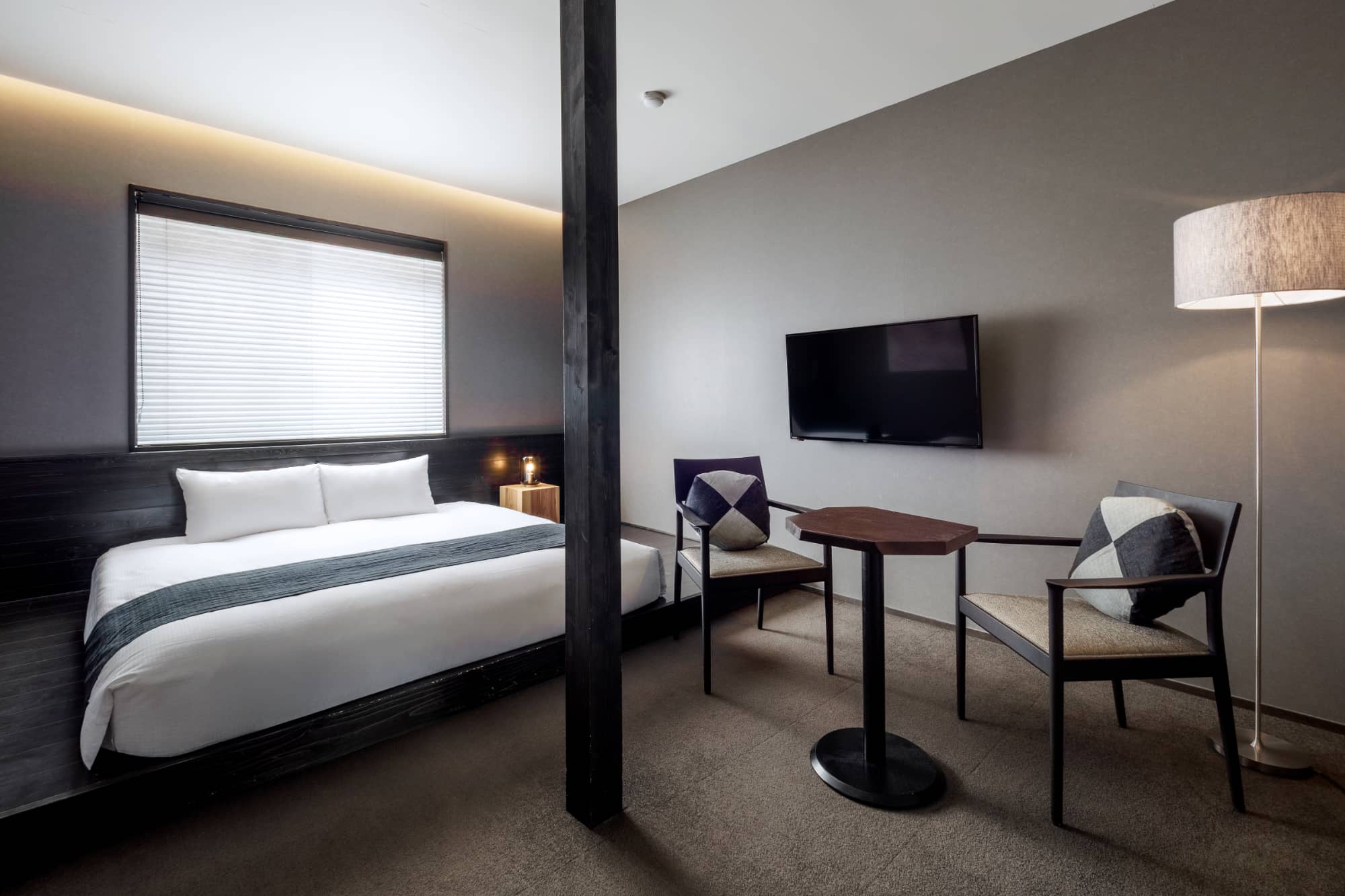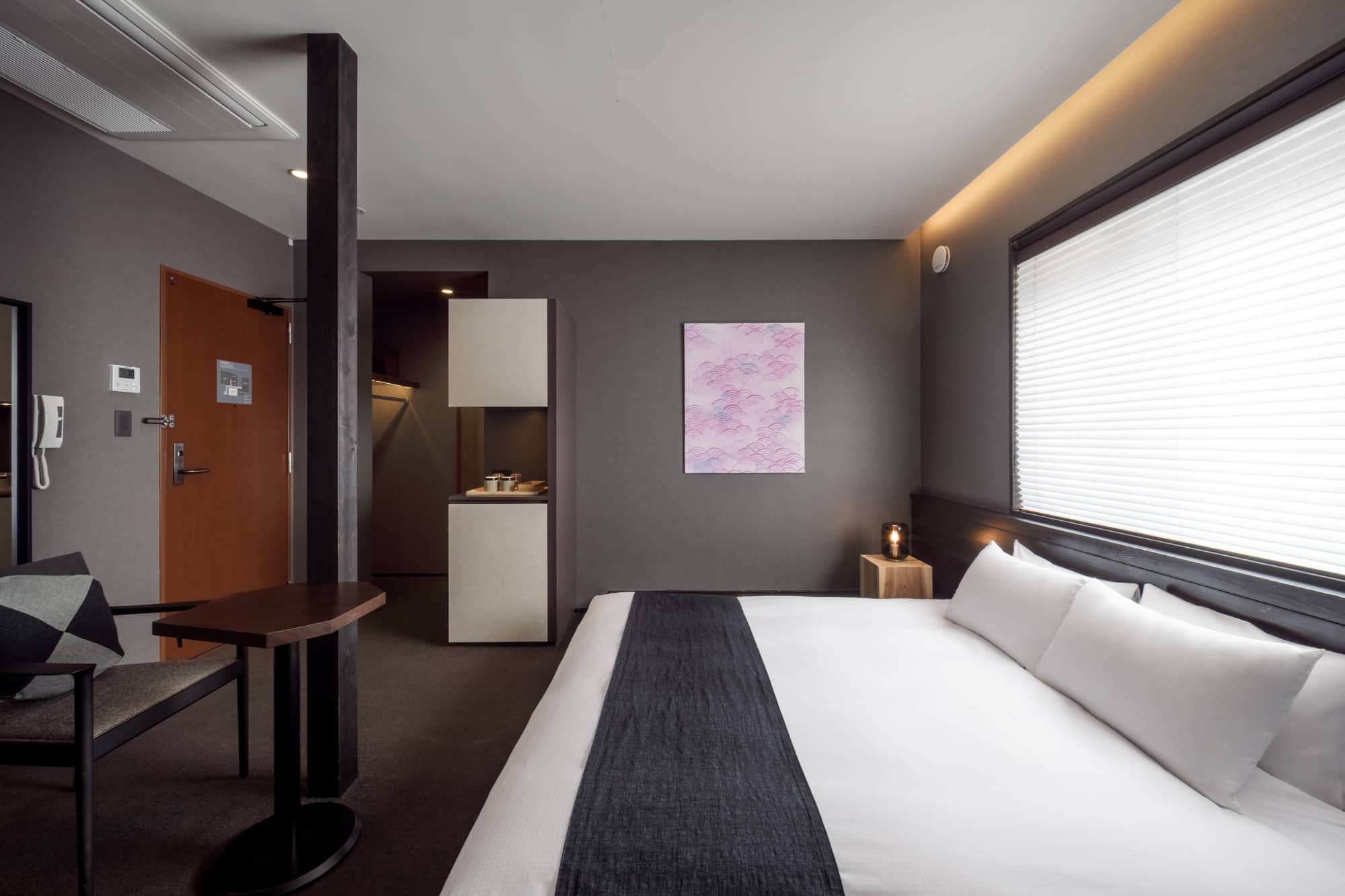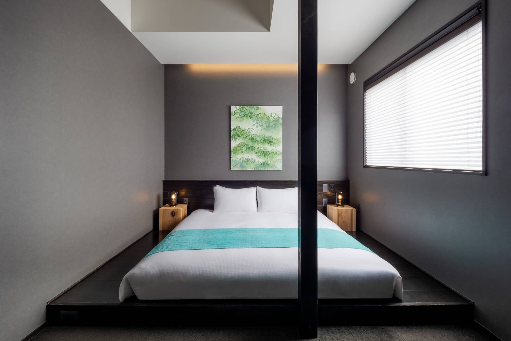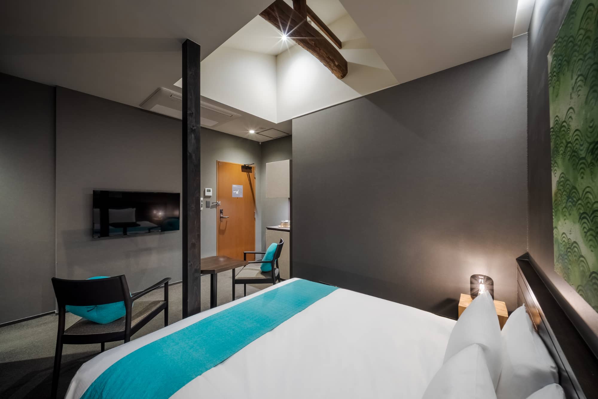 Whether you're staying in this room solo or sharing it with someone else, this room has everything you want and more. A comfortable king bed, original Japanese 'seigaiha' artwork, and high ceilings that showcase the wooden beams which were part of the original machiya architecture.